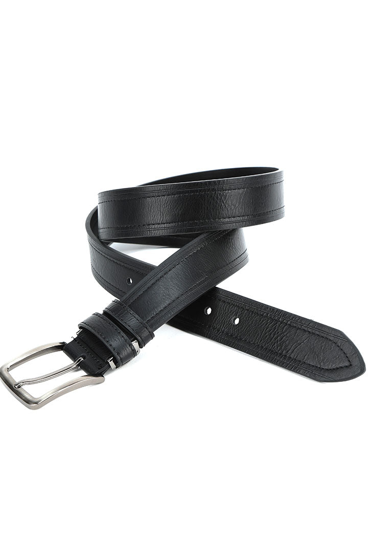 Elevate your semi-formal look with the Binnino Flat PU Belt with Stitch Fit by Metal Clamp in Black. Made from premium PU leather, this belt combines functionality and style with its sleek black color, detailed stitching, and metal clamp for a secure fit. A versatile addition to any wardrobe, it complements both casual and formal outfits, adding a refined touch.