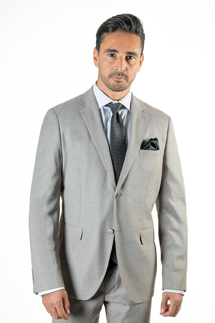 The FRANCISCO TOLLI SS25 suit is a refined formalwear essential crafted in a regular fit with a two-button front and double-vented back. Its soft neutral tone offers versatile styling options, whether you're dressing for daytime events, weddings, or formal office wear. Designed for all-day comfort and polish, the silhouette balances timeless tailoring with modern ease. Complete with subtle inner detailing and clean structure, this piece brings effortless elegance to your wardrobe.
